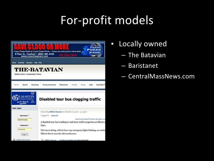 1. 6. For-profit models <ul><li>Locally owned </li></ul><ul><ul><li>The Batavian </li></ul></ul><ul><ul><li>Baristanet </li></ul></ul><ul><ul><li>CentralMassNews.com </li></ul></ul>