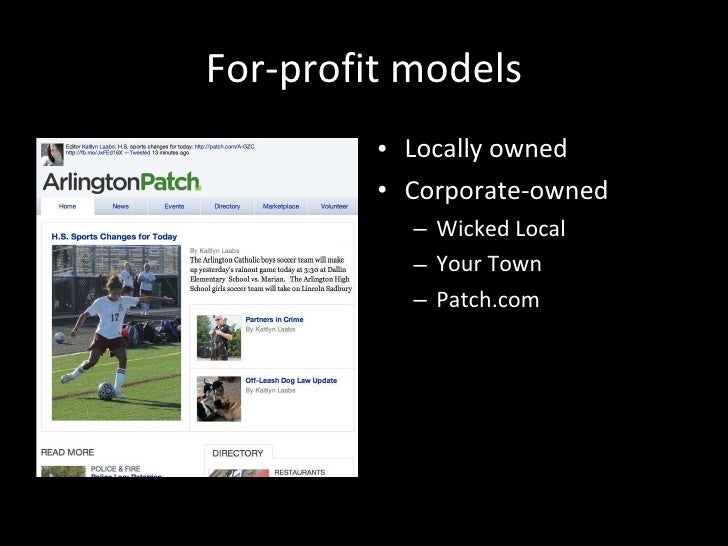 2. 7. For-profit models <ul><li>Locally owned </li></ul><ul><li>Corporate-owned </li></ul><ul><ul><li>Wicked Local </li></ul></ul><ul><ul><li>Your Town </li></ul></ul><ul><ul><li>Patch.com </li></ul></ul>