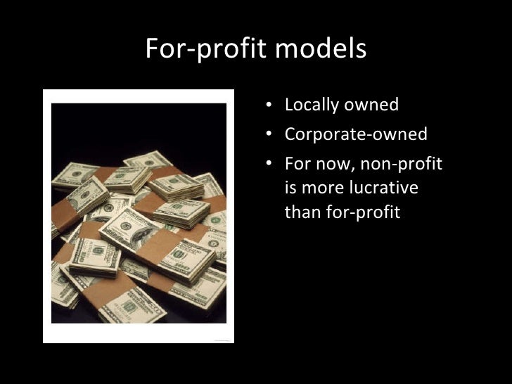 3. 8. For-profit models <ul><li>Locally owned </li></ul><ul><li>Corporate-owned </li></ul><ul><li>For now, non-profit is more lucrative than for-profit </li></ul>