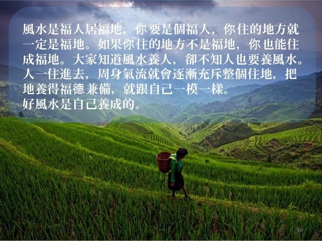 自己身上的風水 - 大家知道風水養人,卻不知人也要養風水。人一住進去,周身氣流就會逐漸充斥整個住地,把地養得福德兼備,就跟自己一模一樣。 好風水是自己養成的. www.dm1314.com