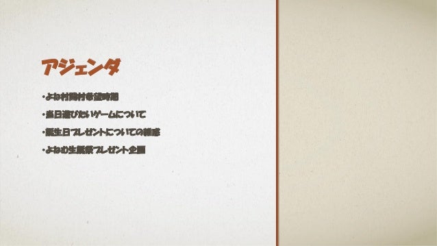 2. 2. アジェンダ ・よね村開村希望時期 ・当日遊びたいゲームについて ・誕生日プレゼントについての雑感 ・よねむ生誕祭プレゼント企画