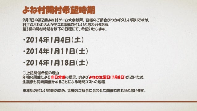 3. 3. よね村開村希望時期 9月7日の第2回よね村ゲーム大会以降、皆様のご都合がつかず久しい限りですが、 村主のよねむさんが冬コミ準備で忙しいと思われるため、 第3回の開村時期を以下の日程にて、希望いたします。 ・2014年1月4日(土) ・2014年1月11日(土) ・2014年1月18日(土) ○上記開催希望の理由 年始の開催による非日常感の提示、およびよねむ生誕日(1月8日)が近いため、 生誕祭と同時開催をすることによる時間コストの短縮 ※年始の忙しい時期のため、皆様のご都合に合わせて開催できればと思います。
