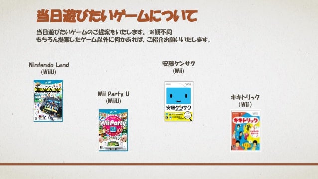 4. 4. 当日遊びたいゲームについて 当日遊びたいゲームのご提案をいたします。 ※順不同 もちろん提案したゲーム以外に何かあれば、ご紹介お願いいたします。 安藤ケンサク (Wii) Nintendo Land (WiiU) Wii Party U (WiiU) キキトリック (Wii)