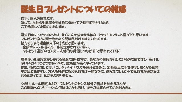 5. 5. 誕生日プレゼントについての雑感 以下、個人の感想です。 決して、よねむ生誕祭を迎えるにあたっての批判ではないため、 ご了承宜しくお願いいたします。 誕生日会につきものであり、多くの人を悩ませる存在、それがプレゼント選びだと思います。 プレゼント選びに頭を抱えた人間は私だけではないはずです。 悩んでしまう理由は以下の2点だと思います。 ・金額やジャンル等のルール制定がされていない。 ・プレゼント選びのセンス=人格的な評価につながる(と思われている) 前者は、金額設定がしかれる場合もありますが、最初から値段がバレているのも癪ですし、高けれ ばいいということでもないので、難易度が高くなっています。 また、後者に関しては、「コレジャナイ」リスクを避けるために、定番商品に手を伸ばしたくなる気持 ちが出てきますし、友人を純粋に祝う気持ちは一緒なのに、選んだプレゼントで気持ちが値踏みさ れるとあっては、気が気でなりません。 つまり、ルール制定および、プレゼントのセンス以外の観点を加えることが、 この問題へのソリューションではないかと思い、次をご提案させていただきます。