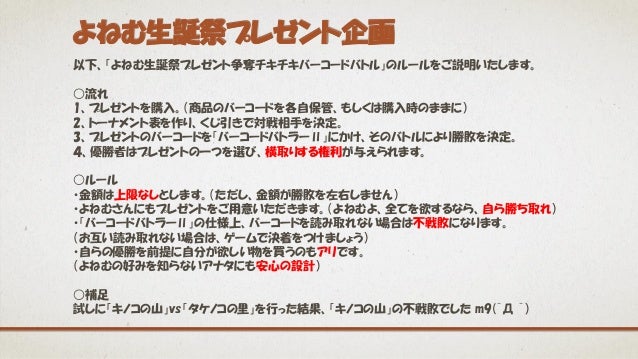 6. 6. よねむ生誕祭プレゼント企画 以下、「よねむ生誕祭プレゼント争奪チキチキバーコードバトル」のルールをご説明いたします。 ○流れ 1、プレゼントを購入。(商品のバーコードを各自保管、もしくは購入時のままに) 2、トーナメント表を作り、くじ引きで対戦相手を決定。 3、プレゼントのバーコードを「バーコードバトラーⅡ」にかけ、そのバトルにより勝敗を決定。 4、優勝者はプレゼントの一つを選び、横取りする権利が与えられます。 ○ルール ・金額は上限なしとします。(ただし、金額が勝敗を左右しません) ・よねむさんにもプレゼントをご用意いただきます。(よねむよ、全てを欲するなら、自ら勝ち取れ) ・「バーコードバトラーⅡ」の仕様上、バーコードを読み取れない場合は不戦敗になります。 (お互い読み取れない場合は、ゲームで決着をつけましょう) ・自らの優勝を前提に自分が欲しい物を買うのもアリです。 (よねむの好みを知らないアナタにも安心の設計) ○補足 試しに「キノコの山」vs「タケノコの里」を行った結果、「キノコの山」の不戦敗でした m9(^Д ^)