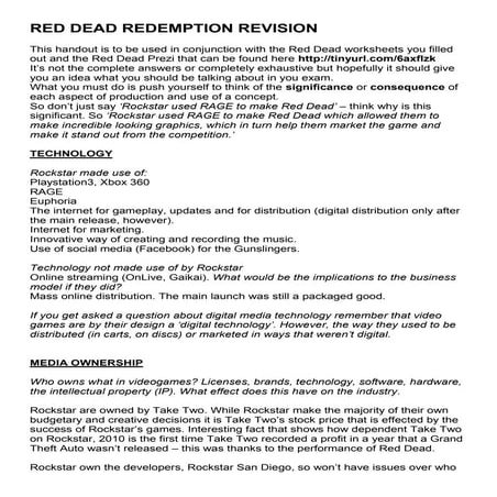 3. 3. and new games that will be coming out. So when they see Red Dead Redemption spread all over the website as their next huge game, people are bound to be interesting in looking and watching the trailers. Rockstar also do a good job as directing people to where they can pre order easily in all of the different countries that they may be watching from. This promotion method can have very varying results as it only works if people go onto the website and if they donʼt then it is a waste of time. Also people may just ignore these advertisements because they think they will not live up to other Rockstar games. Digital Marketing This type of marketing is growing more popular everyday because it is mainly done over social networking sites such as Youtube, Facebook and Twitter. This works well for the promotion of games as the target audience for these types of games all have accounts and spend large amounts of time of them. Rockstar have a verified twitter account where they tweet updates on their new game as well as previews and trailers. This encourages their target audience to follow them to be aware when the trailers are released, but for rockstar this gives them a chance to keep reminding them about the games release date and how great the game is going to be. On Facebook its similar but its more done by sharing the page and then your friends see that you have been on it and want to also see what it is about and then they will share it and it becomes a sharing cycle with spreads the game into a wide market that it would have not been able to do without it. This method spreads to such a huge audience and this is a positive because more people will know about the game. However just because they have seen the name and the logo does not mean they are suddenly going to buy the game and become a huge fan. Most of the people who see the advertisement or the page will click straight off it and then forget all about it, because their are so many other products and companies doing the exact thing. Direct Marketing Red Dead Redemption used a direct website in a way of promotion. This could be found through many different means including google and links off the Rockstar website. This method of marketing is good because it look professional and well presented as they have their own space that they can design to be how they want to to be. It is also a great place for them to put up information about the game to give to their audience. The audience and potential gamers always react well to being able to find all the information, pictures and trailers in own easy to find place. UNIT04-A01 Lucy Taylor PromotionPROMOTION