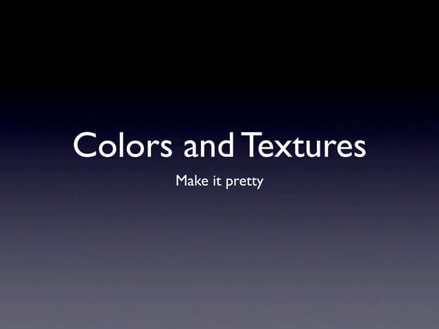 89. 89. Elastic Image Software LLC 89 http://github.com/turner/HelloiPadGLSL/blob/master/Shaders/ShowST.fsh // ShowST.fsh varying vec2 v_st; void main() { // Visualize the s-t parameterization of the underlying surface gl_FragColor.r = v_st.s; gl_FragColor.g = v_st.t; gl_FragColor.b = 0.0; gl_FragColor.a = 1.0; } The texture coordinate values v_st.s and v_st.t are for the red and green channels of the shader color.