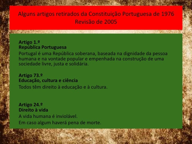 14. 14. Alguns artigos retirados da Constituição Portuguesa de 1976 Revisão de 2005<br />Artigo 1.º República Portuguesa <br /> Portugal é uma República soberana, baseada na dignidade da pessoa humana e na vontade popular e empenhada na construção de uma sociedade livre, justa e solidária.<br /> Artigo 73.ºEducação, cultura e ciência<br />Todos têm direito à educação e à cultura. <br />Artigo 24.ºDireito à vida<br /> A vida humana é inviolável. <br /> Em caso algum haverá pena de morte.<br />