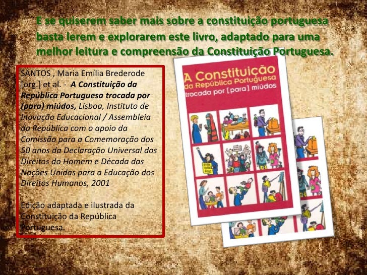 15. 15. E se quiserem saber mais sobre a constituição portuguesa basta lerem e explorarem este livro, adaptado para uma melhor leitura e compreensão da Constituição Portuguesa.<br />SANTOS , Maria Emília Brederode [org.] et al. - A Constituição da República Portuguesa trocada por (para) miúdos, Lisboa, Instituto de Inovação Educacional / Assembleia da República com o apoio da Comissão para a Comemoração dos 50 anos da Declaração Universal dos Direitos do Homem e Década das Nações Unidas para a Educação dos Direitos Humanos, 2001<br />Edição adaptada e ilustrada da Constituição da República Portuguesa.<br />