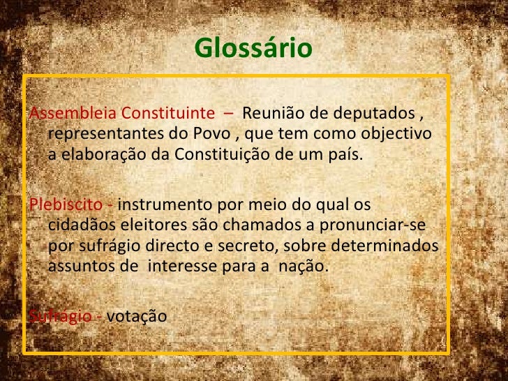 16. 16. Glossário<br />Assembleia Constituinte – Reunião de deputados , representantes do Povo , que tem como objectivo a elaboração da Constituição de um país. <br />Plebiscito - instrumento por meio do qual os cidadãos eleitores são chamados a pronunciar-se por sufrágio directo e secreto, sobre determinados assuntos de interesse para a nação.<br />Sufrágio - votação<br />