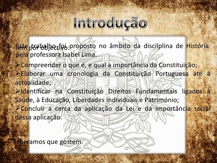 2. 2. Introdução<br />Este trabalho foi proposto no âmbito da discilplina de História pela professora Isabel Lima.<br />Tem por objectivo: <br /><ul><li>Compreender o que é, e qual a importância da Constituição;