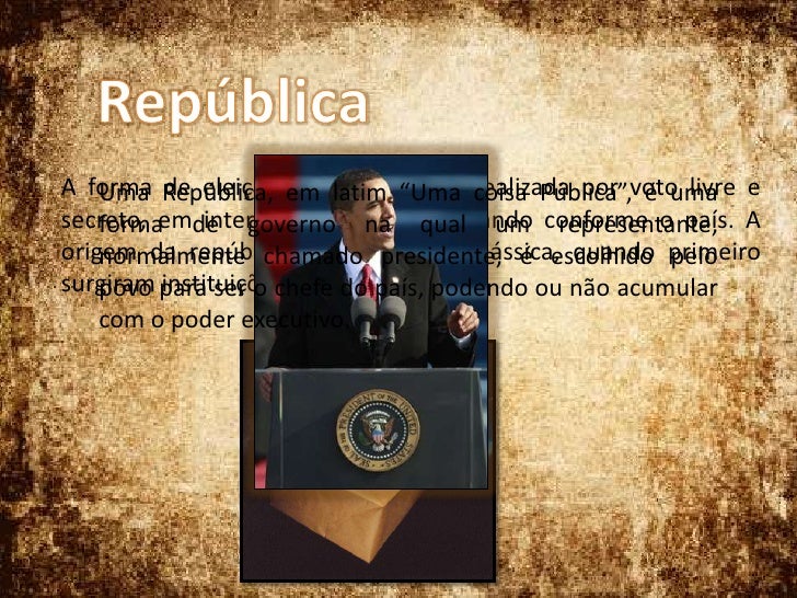 6. 6. República<br />Uma República, em latim “Uma coisa Pública”, é uma forma de governo na qual um representante, normalmente chamado presidente, é escolhido pelo povo para ser o chefedo país, podendo ou não acumular com o poder executivo. <br />A forma de eleição é normalmente realizada por voto livre e secreto, em intervalos regulares, variando conforme o país. A origem da república está na Roma clássica, quando primeiro surgiram instituições como o Senado.<br />