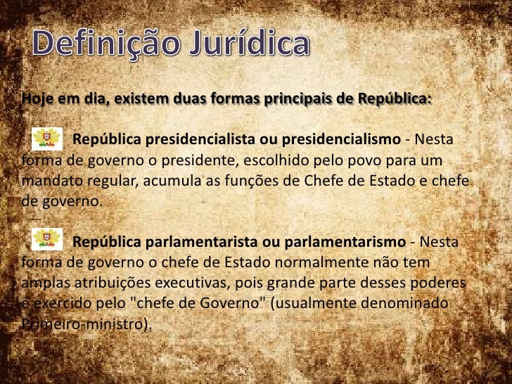 7. 7. Definição Jurídica<br />Hoje em dia, existem duas formas principais de República:<br /> República presidencialista ou presidencialismo - Nesta forma de governo o presidente, escolhido pelo povo para um mandato regular, acumula as funções de Chefe de Estado e chefe de governo. <br />República parlamentarista ou parlamentarismo - Nesta forma de governo o chefe de Estado normalmente não tem amplas atribuições executivas, pois grande parte desses poderes é exercido pelo "chefe de Governo" (usualmente denominado Primeiro-ministro). <br />