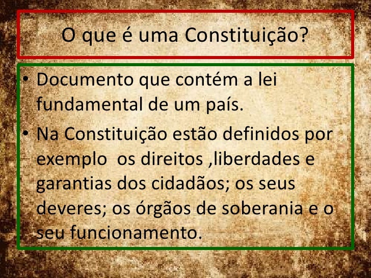 O que é uma Constituição?<br />Documento que contém a lei fundamental de um país. <br />Na Constituição estão definidos po...