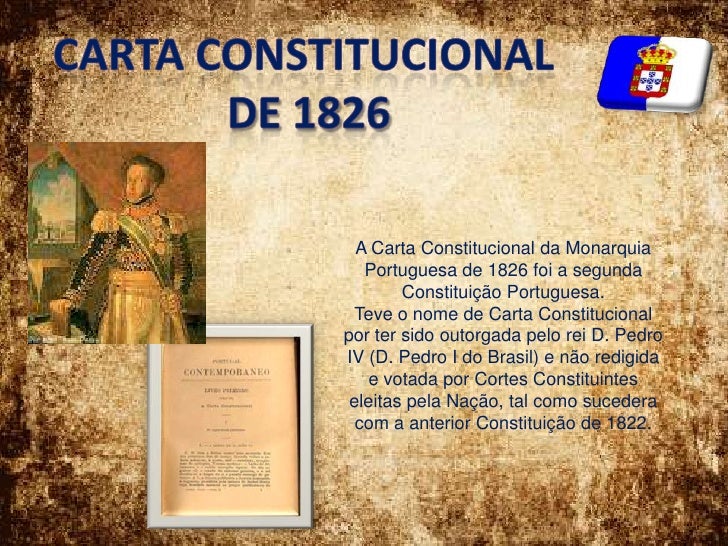 CARTA CONSTITUCIONAL<br /> de 1826<br />A Carta Constitucional da Monarquia Portuguesa de 1826 foi a segunda Constituição ...