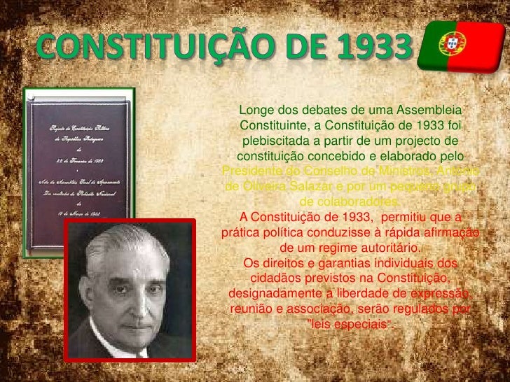 12. 12. CONSTITUIÇÃO DE 1933<br />Longe dos debates de uma Assembleia Constituinte, a Constituição de 1933 foi plebiscitada a partir de um projecto de constituição concebido e elaborado pelo Presidente do Conselho de Ministros, António de Oliveira Salazar e por um pequeno grupo de colaboradores.A Constituição de 1933, permitiu que a prática política conduzisse à rápida afirmação de um regime autoritário.Os direitos e garantias individuais dos cidadãos previstos na Constituição, designadamente a liberdade de expressão, reunião e associação, serão regulados por "leis especiais"..<br />