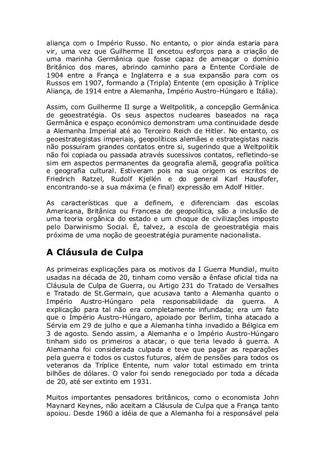 10. 10. aliança com o Império Russo. No entanto, o pior ainda estaria para vir, uma vez que Guilherme II encetou esforços para a criação de uma marinha Germânica que fosse capaz de ameaçar o domínio Britânico dos mares, abrindo caminho para a Entente Cordiale de 1904 entre a França e Inglaterra e a sua expansão para com os Russos em 1907, formando a (Tripla) Entente (em oposição à Tríplice Aliança, de 1914 entre a Alemanha, Império Austro-Húngaro e Itália). Assim, com Guilherme II surge a Weltpolitik, a concepção Germânica de geoestratégia. Os seus aspectos nucleares baseados na raça Germânica e espaço económico demonstram uma continuidade desde a Alemanha Imperial até ao Terceiro Reich de Hitler. No entanto, os geoestrategistas imperiais, geopolíticos alemães e estrategistas nazis não possuíram grandes contatos entre si, sugerindo que a Weltpolitik não foi copiada ou passada através sucessivos contatos, refletindo-se sim em aspectos permanentes da geografia alemã, geografia política e geografia cultural. Estiveram pois na sua origem os escritos de Friedrich Ratzel, Rudolf Kjellén e do general Karl Hausfofer, encontrando-se a sua máxima (e final) expressão em Adolf Hitler. As características que a definem, e diferenciam das escolas Americana, Britânica ou Francesa de geopolítica, são a inclusão de uma teoria orgânica do estado e um choque de civilizações imposto pelo Darwinismo Social. É, talvez, a escola de geoestratégia mais próxima de uma noção de geoestratégia puramente nacionalista. A Cláusula de Culpa As primeiras explicações para os motivos da I Guerra Mundial, muito usadas na década de 20, tinham como versão a ênfase oficial tida na Cláusula de Culpa de Guerra, ou Artigo 231 do Tratado de Versalhes e Tratado de St.Germain, que acusava tanto a Alemanha quanto o Império Austro-Húngaro pela responsabilidade da guerra. A explicação para tal não era completamente infundada; era um fato que o Império Austro-Húngaro, apoiado por Berlim, tinha atacado a Sérvia em 29 de julho e que a Alemanha tinha invadido a Bélgica em 3 de agosto. Sendo assim, a Alemanha e o Império Austro-Húngaro tinham sido os primeiros a atacar, o que teria levado à guerra. A Alemanha foi considerada culpada e teve que pagar as reparações pela guerra e todos os custos futuros, além de pensões para todos os veteranos da Tríplice Entente, num valor total estimado em trinta bilhões de dólares. O valor foi sendo renegociado por toda a década de 20, até ser extinto em 1931. Muitos importantes pensadores britânicos, como o economista John Maynard Keynes, não aceitam a Cláusula de Culpa que a França tanto apoiou. Desde 1960 a idéia de que a Alemanha foi a responsável pela