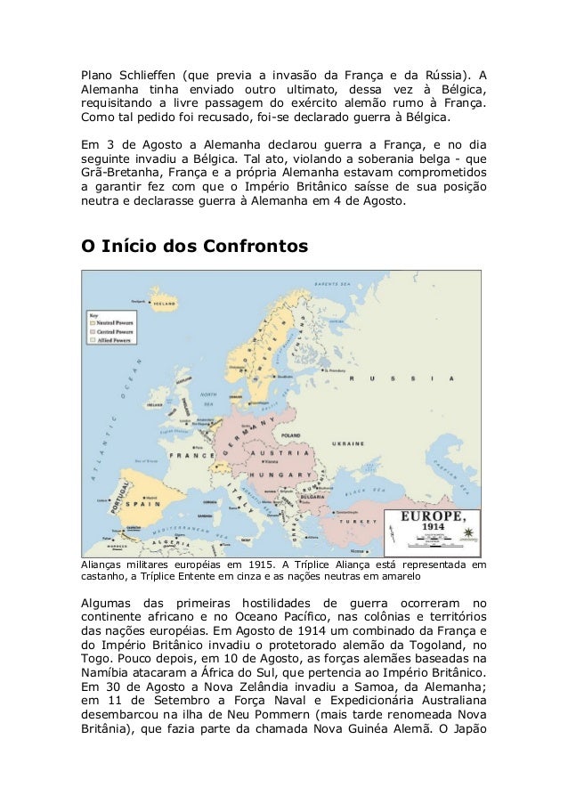 15. 15. Plano Schlieffen (que previa a invasão da França e da Rússia). A Alemanha tinha enviado outro ultimato, dessa vez à Bélgica, requisitando a livre passagem do exército alemão rumo à França. Como tal pedido foi recusado, foi-se declarado guerra à Bélgica. Em 3 de Agosto a Alemanha declarou guerra a França, e no dia seguinte invadiu a Bélgica. Tal ato, violando a soberania belga - que Grã-Bretanha, França e a própria Alemanha estavam comprometidos a garantir fez com que o Império Britânico saísse de sua posição neutra e declarasse guerra à Alemanha em 4 de Agosto. O Início dos Confrontos Alianças militares européias em 1915. A Tríplice Aliança está representada em castanho, a Tríplice Entente em cinza e as nações neutras em amarelo Algumas das primeiras hostilidades de guerra ocorreram no continente africano e no Oceano Pacífico, nas colônias e territórios das nações européias. Em Agosto de 1914 um combinado da França e do Império Britânico invadiu o protetorado alemão da Togoland, no Togo. Pouco depois, em 10 de Agosto, as forças alemães baseadas na Namíbia atacaram a África do Sul, que pertencia ao Império Britânico. Em 30 de Agosto a Nova Zelândia invadiu a Samoa, da Alemanha; em 11 de Setembro a Força Naval e Expedicionária Australiana desembarcou na ilha de Neu Pommern (mais tarde renomeada Nova Britânia), que fazia parte da chamada Nova Guinéa Alemã. O Japão