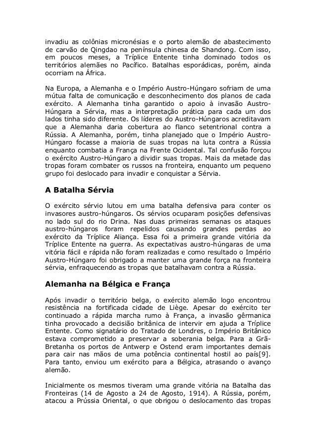 16. 16. invadiu as colônias micronésias e o porto alemão de abastecimento de carvão de Qingdao na península chinesa de Shandong. Com isso, em poucos meses, a Tríplice Entente tinha dominado todos os territórios alemães no Pacífico. Batalhas esporádicas, porém, ainda ocorriam na África. Na Europa, a Alemanha e o Império Austro-Húngaro sofriam de uma mútua falta de comunicação e desconhecimento dos planos de cada exército. A Alemanha tinha garantido o apoio à invasão Austro- Húngara a Sérvia, mas a interpretação prática para cada um dos lados tinha sido diferente. Os líderes do Austro-Húngaros acreditavam que a Alemanha daria cobertura ao flanco setentrional contra a Rússia. A Alemanha, porém, tinha planejado que o Império Austro- Húngaro focasse a maioria de suas tropas na luta contra a Rússia enquanto combatia a França na Frente Ocidental. Tal confusão forçou o exército Austro-Húngaro a dividir suas tropas. Mais da metade das tropas foram combater os russos na fronteira, enquanto um pequeno grupo foi deslocado para invadir e conquistar a Sérvia. A Batalha Sérvia O exército sérvio lutou em uma batalha defensiva para conter os invasores austro-húngaros. Os sérvios ocuparam posições defensivas no lado sul do rio Drina. Nas duas primeiras semanas os ataques austro-húngaros foram repelidos causando grandes perdas ao exército da Tríplice Aliança. Essa foi a primeira grande vitória da Tríplice Entente na guerra. As expectativas austro-húngaras de uma vitória fácil e rápida não foram realizadas e como resultado o Império Austro-Húngaro foi obrigado a manter uma grande força na fronteira sérvia, enfraquecendo as tropas que batalhavam contra a Rússia. Alemanha na Bélgica e França Após invadir o território belga, o exército alemão logo encontrou resistência na fortificada cidade de Liège. Apesar do exército ter continuado a rápida marcha rumo à França, a invasão gêrmanica tinha provocado a decisião britânica de intervir em ajuda a Tríplice Entente. Como signatário do Tratado de Londres, o Império Britânico estava comprometido a preservar a soberania belga. Para a Grã- Bretanha os portos de Antwerp e Ostend eram importantes demais para cair nas mãos de uma potência continental hostil ao país[9]. Para tanto, enviou um exército para a Bélgica, atrasando o avanço alemão. Inicialmente os mesmos tiveram uma grande vitória na Batalha das Fronteiras (14 de Agosto a 24 de Agosto, 1914). A Rússia, porém, atacou a Prússia Oriental, o que obrigou o deslocamento das tropas