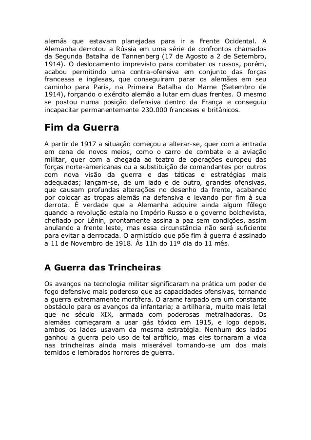 17. 17. alemãs que estavam planejadas para ir a Frente Ocidental. A Alemanha derrotou a Rússia em uma série de confrontos chamados da Segunda Batalha de Tannenberg (17 de Agosto a 2 de Setembro, 1914). O deslocamento imprevisto para combater os russos, porém, acabou permitindo uma contra-ofensiva em conjunto das forças francesas e inglesas, que conseguiram parar os alemães em seu caminho para Paris, na Primeira Batalha do Marne (Setembro de 1914), forçando o exército alemão a lutar em duas frentes. O mesmo se postou numa posição defensiva dentro da França e conseguiu incapacitar permanentemente 230.000 franceses e britânicos. Fim da Guerra A partir de 1917 a situação começou a alterar-se, quer com a entrada em cena de novos meios, como o carro de combate e a aviação militar, quer com a chegada ao teatro de operações europeu das forças norte-americanas ou a substituição de comandantes por outros com nova visão da guerra e das táticas e estratégias mais adequadas; lançam-se, de um lado e de outro, grandes ofensivas, que causam profundas alterações no desenho da frente, acabando por colocar as tropas alemãs na defensiva e levando por fim à sua derrota. É verdade que a Alemanha adquire ainda algum fôlego quando a revolução estala no Império Russo e o governo bolchevista, chefiado por Lênin, prontamente assina a paz sem condições, assim anulando a frente leste, mas essa circunstância não será suficiente para evitar a derrocada. O armistício que põe fim à guerra é assinado a 11 de Novembro de 1918. Às 11h do 11º dia do 11 mês. A Guerra das Trincheiras Os avanços na tecnologia militar significaram na prática um poder de fogo defensivo mais poderoso que as capacidades ofensivas, tornando a guerra extremamente mortífera. O arame farpado era um constante obstáculo para os avanços da infantaria; a artilharia, muito mais letal que no século XIX, armada com poderosas metralhadoras. Os alemães começaram a usar gás tóxico em 1915, e logo depois, ambos os lados usavam da mesma estratégia. Nenhum dos lados ganhou a guerra pelo uso de tal artíficio, mas eles tornaram a vida nas trincheiras ainda mais miserável tornando-se um dos mais temidos e lembrados horrores de guerra.