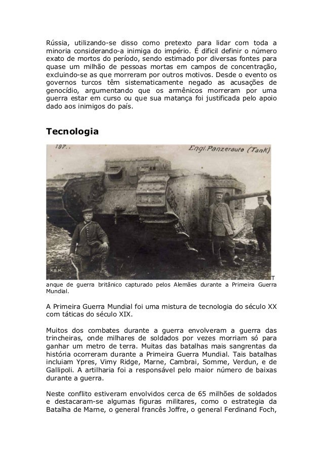 19. 19. Rússia, utilizando-se disso como pretexto para lidar com toda a minoria considerando-a inimiga do império. É dificil definir o número exato de mortos do período, sendo estimado por diversas fontes para quase um milhão de pessoas mortas em campos de concentração, excluindo-se as que morreram por outros motivos. Desde o evento os governos turcos têm sistematicamente negado as acusações de genocídio, argumentando que os armênicos morreram por uma guerra estar em curso ou que sua matança foi justificada pelo apoio dado aos inimigos do país. Tecnologia T anque de guerra britânico capturado pelos Alemães durante a Primeira Guerra Mundial. A Primeira Guerra Mundial foi uma mistura de tecnologia do século XX com táticas do século XIX. Muitos dos combates durante a guerra envolveram a guerra das trincheiras, onde milhares de soldados por vezes morriam só para ganhar um metro de terra. Muitas das batalhas mais sangrentas da história ocorreram durante a Primeira Guerra Mundial. Tais batalhas incluiam Ypres, Vimy Ridge, Marne, Cambrai, Somme, Verdun, e de Gallipoli. A artilharia foi a responsável pelo maior número de baixas durante a guerra. Neste conflito estiveram envolvidos cerca de 65 milhões de soldados e destacaram-se algumas figuras militares, como o estrategia da Batalha de Marne, o general francês Joffre, o general Ferdinand Foch,
