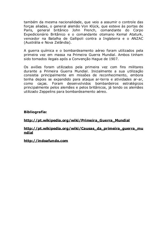 20. 20. também da mesma nacionalidade, que veio a assumir o controle das forças aliadas, o general alemão Von Klück, que esteve às portas de Paris, general britânico John French, comandante do Corpo Expedicionário Britânico e o comandante otomano Kemal Ataturk, vencedor na Batalha de Gallipoli contra a Inglaterra e o ANZAC (Austrália e Nova Zelândia). A guerra química e o bombardeamento aéreo foram utilizados pela primeira vez em massa na Primeira Guerra Mundial. Ambos tinham sido tornados ilegais após a Convenção Hague de 1907. Os aviões foram utilizados pela primeira vez com fins militares durante a Primeira Guerra Mundial. Inicialmente a sua utilização consistia principalmente em missões de reconhecimento, embora tenha depois se expandido para ataque ar-terra e atividades ar-ar, como caças. Foram desenvolvidos bombardeiros estratégicos principalmente pelos alemães e pelos britânicos, já tendo os alemães utilizado Zeppelins para bombardeamento aéreo. Bibliografia: http://pt.wikipedia.org/wiki/Primeira_Guerra_Mundial http://pt.wikipedia.org/wiki/Causas_da_primeira_guerra_mu ndial http://indoafundo.com