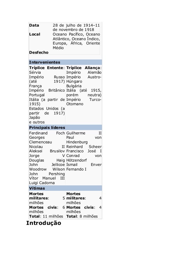 3. 3. Data 28 de julho de 1914–11 de novembro de 1918 Local Oceano Pacífico, Oceano Atlântico, Oceano Índico, Europa, África, Oriente Médio Desfecho Intervenientes Tríplice Entente: Sérvia Império Russo (até 1917) França Império Britânico Portugal Itália (a partir de 1915) Estados Unidos (a partir de 1917) Japão e outros Tríplice Aliança: Império Alemão Império Austro- Húngaro Bulgária Itália (até 1915, porém neutra) Império Turco- Otomano Principais líderes Ferdinand Foch Georges Clemenceau Nicolau II Aleksei Brusilov Jorge V Douglas Haig John Jellicoe Woodrow Wilson John Pershing Vítor Manuel III Luigi Cadorna Guilherme II Paul von Hindenburg Reinhard Scheer Francisco José I Conrad von Hötzendorf İsmail Enver Fernando I Vítimas Mortes militares: 5 milhões Mortes civis: 6 milhões Total: 11 milhões Mortes militares: 4 milhões Mortes civis: 4 milhões Total: 8 milhões Introdução
