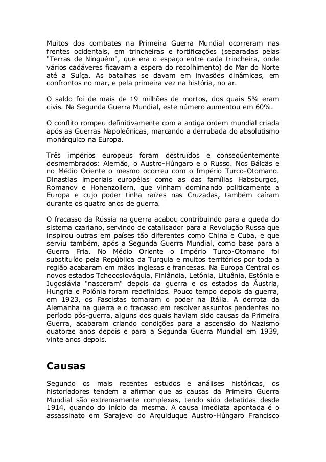 4. 4. Muitos dos combates na Primeira Guerra Mundial ocorreram nas frentes ocidentais, em trincheiras e fortificações (separadas pelas "Terras de Ninguém", que era o espaço entre cada trincheira, onde vários cadáveres ficavam a espera do recolhimento) do Mar do Norte até a Suíça. As batalhas se davam em invasões dinâmicas, em confrontos no mar, e pela primeira vez na história, no ar. O saldo foi de mais de 19 milhões de mortos, dos quais 5% eram civis. Na Segunda Guerra Mundial, este número aumentou em 60%. O conflito rompeu definitivamente com a antiga ordem mundial criada após as Guerras Napoleônicas, marcando a derrubada do absolutismo monárquico na Europa. Três impérios europeus foram destruídos e conseqüentemente desmembrados: Alemão, o Austro-Húngaro e o Russo. Nos Bálcãs e no Médio Oriente o mesmo ocorreu com o Império Turco-Otomano. Dinastias imperiais européias como as das famílias Habsburgos, Romanov e Hohenzollern, que vinham dominando politicamente a Europa e cujo poder tinha raízes nas Cruzadas, também caíram durante os quatro anos de guerra. O fracasso da Rússia na guerra acabou contribuindo para a queda do sistema czariano, servindo de catalisador para a Revolução Russa que inspirou outras em países tão diferentes como China e Cuba, e que serviu também, após a Segunda Guerra Mundial, como base para a Guerra Fria. No Médio Oriente o Império Turco-Otomano foi substituído pela República da Turquia e muitos territórios por toda a região acabaram em mãos inglesas e francesas. Na Europa Central os novos estados Tchecoslováquia, Finlândia, Letônia, Lituânia, Estônia e Iugoslávia "nasceram" depois da guerra e os estados da Áustria, Hungria e Polônia foram redefinidos. Pouco tempo depois da guerra, em 1923, os Fascistas tomaram o poder na Itália. A derrota da Alemanha na guerra e o fracasso em resolver assuntos pendentes no período pós-guerra, alguns dos quais haviam sido causas da Primeira Guerra, acabaram criando condições para a ascensão do Nazismo quatorze anos depois e para a Segunda Guerra Mundial em 1939, vinte anos depois. Causas Segundo os mais recentes estudos e análises históricas, os historiadores tendem a afirmar que as causas da Primeira Guerra Mundial são extremamente complexas, tendo sido debatidas desde 1914, quando do início da mesma. A causa imediata apontada é o assassinato em Sarajevo do Arquiduque Austro-Húngaro Francisco