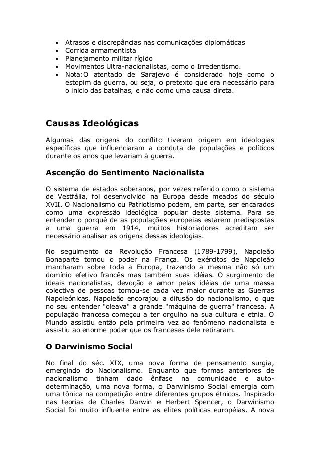 7. 7. • Atrasos e discrepâncias nas comunicações diplomáticas • Corrida armamentista • Planejamento militar rígido • Movimentos Ultra-nacionalistas, como o Irredentismo. • Nota:O atentado de Sarajevo é considerado hoje como o estopim da guerra, ou seja, o pretexto que era necessário para o inicio das batalhas, e não como uma causa direta. Causas Ideológicas Algumas das origens do conflito tiveram origem em ideologias específicas que influenciaram a conduta de populações e políticos durante os anos que levariam à guerra. Ascenção do Sentimento Nacionalista O sistema de estados soberanos, por vezes referido como o sistema de Vestfália, foi desenvolvido na Europa desde meados do século XVII. O Nacionalismo ou Patriotismo podem, em parte, ser encarados como uma expressão ideológica popular deste sistema. Para se entender o porquê de as populações europeias estarem predispostas a uma guerra em 1914, muitos historiadores acreditam ser necessário analisar as origens dessas ideologias. No seguimento da Revolução Francesa (1789-1799), Napoleão Bonaparte tomou o poder na França. Os exércitos de Napoleão marcharam sobre toda a Europa, trazendo a mesma não só um domínio efetivo francês mas também suas idéias. O surgimento de ideais nacionalistas, devoção e amor pelas idéias de uma massa colectiva de pessoas tornou-se cada vez maior durante as Guerras Napoleónicas. Napoleão encorajou a difusão do nacionalismo, o que no seu entender "oleava" a grande "máquina de guerra" francesa. A população francesa começou a ter orgulho na sua cultura e etnia. O Mundo assistiu então pela primeira vez ao fenômeno nacionalista e assistiu ao enorme poder que os franceses dele retiraram. O Darwinismo Social No final do séc. XIX, uma nova forma de pensamento surgia, emergindo do Nacionalismo. Enquanto que formas anteriores de nacionalismo tinham dado ênfase na comunidade e auto- determinação, uma nova forma, o Darwinismo Social emergia com uma tônica na competição entre diferentes grupos étnicos. Inspirado nas teorias de Charles Darwin e Herbert Spencer, o Darwinismo Social foi muito influente entre as elites políticas européias. A nova