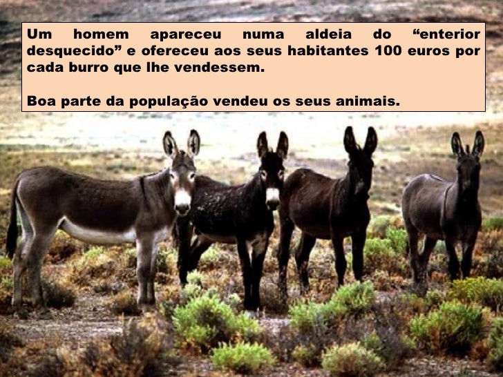 3. 3. Um homem apareceu numa aldeia do “enterior desquecido” e ofereceu aos seus habitantes 100 euros por cada burro que lhe vendessem. Boa parte da população vendeu os seus animais.