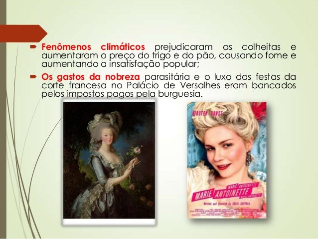 10. 10.  Fenômenos climáticos prejudicaram as colheitas e aumentaram o preço do trigo e do pão, causando fome e aumentando a insatisfação popular;  Os gastos da nobreza parasitária e o luxo das festas da corte francesa no Palácio de Versalhes eram bancados pelos impostos pagos pela burguesia.