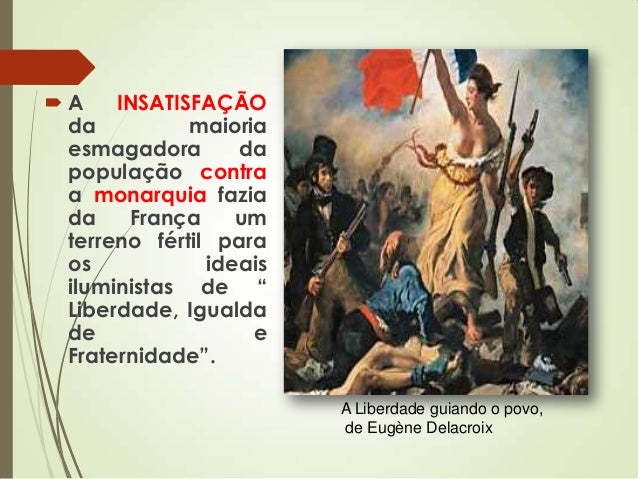 11. 11.  A INSATISFAÇÃO da maioria esmagadora da população contra a monarquia fazia da França um terreno fértil para os ideais iluministas de “ Liberdade, Igualda de e Fraternidade”. A Liberdade guiando o povo, de Eugène Delacroix