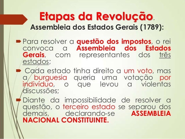 12. 12. Etapas da Revolução. Assembleia dos Estados Gerais (1789): Para resolver a questão dos impostos, o rei convoca a Assembleia dos Estados Gerais, com representantes dos três estados;  Cada estado tinha direito a um voto, mas a burguesia queria uma votação por indivíduo, o que levou a violentas discussões; Diante da impossibilidade de resolver a questão, o terceiro estado se separou dos demais, declarando-se ASSEMBLEIA NACIONAL CONSTITUINTE.