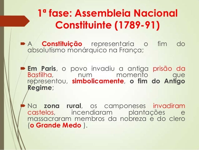 13. 13. 1ª fase: Assembleia Nacional Constituinte (1789-91)  A Constituição representaria o fim do absolutismo monárquico na França;  Em Paris, o povo invadiu a antiga prisão da Bastilha, num momento que representou, simbolicamente, o fim do Antigo Regime;  Na zona rural, os camponeses invadiram castelos, incendiaram plantações e massacraram membros da nobreza e do clero (o Grande Medo ).