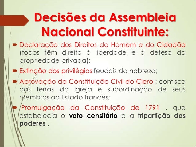 15. 15. Decisões da Assembleia Nacional Constituinte:  Declaração dos Direitos do Homem e do Cidadão (todos têm direito à liberdade e à defesa da propriedade privada);  Extinção dos privilégios feudais da nobreza;  Aprovação da Constituição Civil do Clero : confisco das terras da Igreja e subordinação de seus membros ao Estado francês;  Promulgação da Constituição de 1791 , que estabelecia o voto censitário e a tripartição dos poderes .