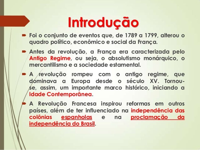 2. 2. Introdução  Foi o conjunto de eventos que, de 1789 a 1799, alterou o quadro político, econômico e social da França.  Antes da revolução, a França era caracterizada pelo Antigo Regime, ou seja, o absolutismo monárquico, o mercantilismo e a sociedade estamental.  A revolução rompeu com o antigo regime, que dominava a Europa desde o século XV. Tornou- se, assim, um importante marco histórico, iniciando a Idade Contemporânea.  A Revolução Francesa inspirou reformas em outros países, além de ter influenciado na independência das colônias espanholas e na proclamação da independência do Brasil.