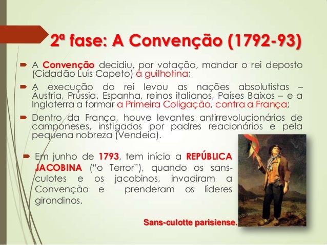 20. 20. 2ª fase: A Convenção (1792-93)  A Convenção decidiu, por votação, mandar o rei deposto (Cidadão Luís Capeto) à guilhotina;  A execução do rei levou as nações absolutistas – Áustria, Prússia, Espanha, reinos italianos, Países Baixos – e a Inglaterra a formar a Primeira Coligação, contra a França;  Dentro da França, houve levantes antirrevolucionários de camponeses, instigados por padres reacionários e pela pequena nobreza (Vendeia). Sans-culotte parisiense.  Em junho de 1793, tem início a REPÚBLICA JACOBINA (“o Terror”), quando os sans- culotes e os jacobinos, invadiram a Convenção e prenderam os líderes girondinos.