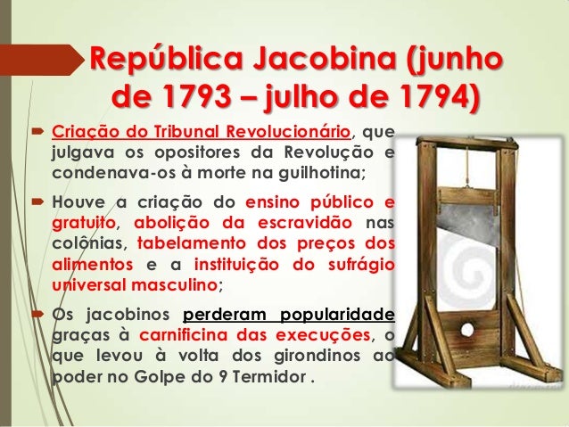 21. 21. República Jacobina (junho de 1793 – julho de 1794)  Criação do Tribunal Revolucionário, que julgava os opositores da Revolução e condenava-os à morte na guilhotina;  Houve a criação do ensino público e gratuito, abolição da escravidão nas colônias, tabelamento dos preços dos alimentos e a instituição do sufrágio universal masculino;  Os jacobinos perderam popularidade graças à carnificina das execuções, o que levou à volta dos girondinos ao poder no Golpe do 9 Termidor .