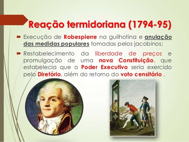 22. 22. Reação termidoriana (1794-95)  Execução de Robespierre na guilhotina e anulação das medidas populares tomadas pelos jacobinos;  Restabelecimento da liberdade de preços e promulgação de uma nova Constituição, que estabelecia que o Poder Executivo seria exercido pelo Diretório, além do retorno do voto censitário .