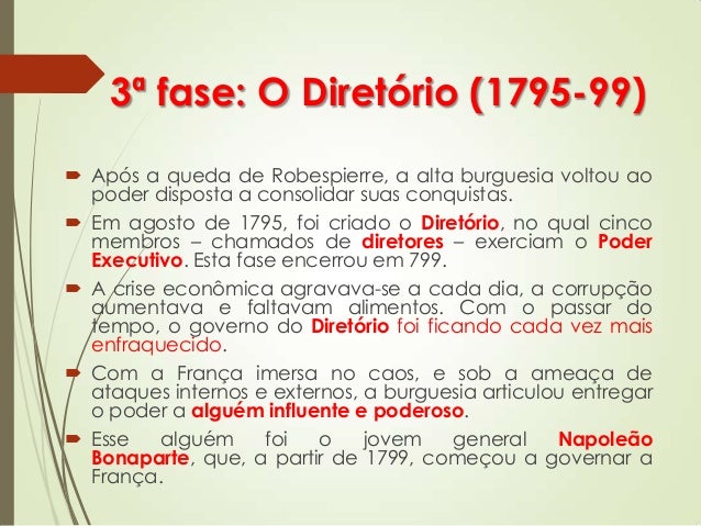23. 23. 3ª fase: O Diretório (1795-99)  Após a queda de Robespierre, a alta burguesia voltou ao poder disposta a consolidar suas conquistas.  Em agosto de 1795, foi criado o Diretório, no qual cinco membros – chamados de diretores – exerciam o Poder Executivo. Esta fase encerrou em 799.  A crise econômica agravava-se a cada dia, a corrupção aumentava e faltavam alimentos. Com o passar do tempo, o governo do Diretório foi ficando cada vez mais enfraquecido.  Com a França imersa no caos, e sob a ameaça de ataques internos e externos, a burguesia articulou entregar o poder a alguém influente e poderoso.  Esse alguém foi o jovem general Napoleão Bonaparte, que, a partir de 1799, começou a governar a França.