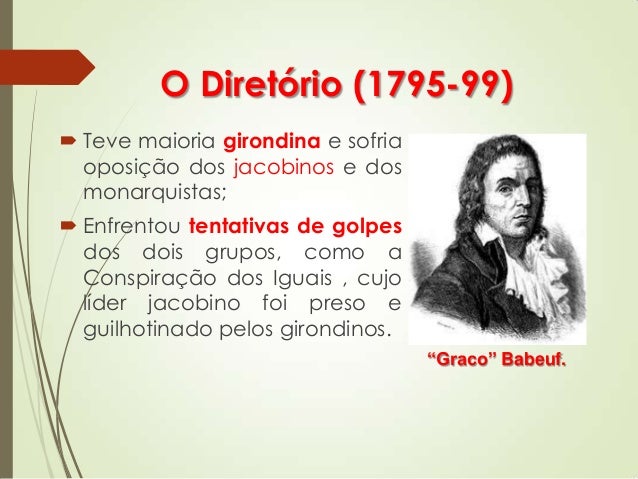 24. 24. O Diretório (1795-99)  Teve maioria girondina e sofria oposição dos jacobinos e dos monarquistas;  Enfrentou tentativas de golpes dos dois grupos, como a Conspiração dos Iguais , cujo líder jacobino foi preso e guilhotinado pelos girondinos. “Graco” Babeuf.