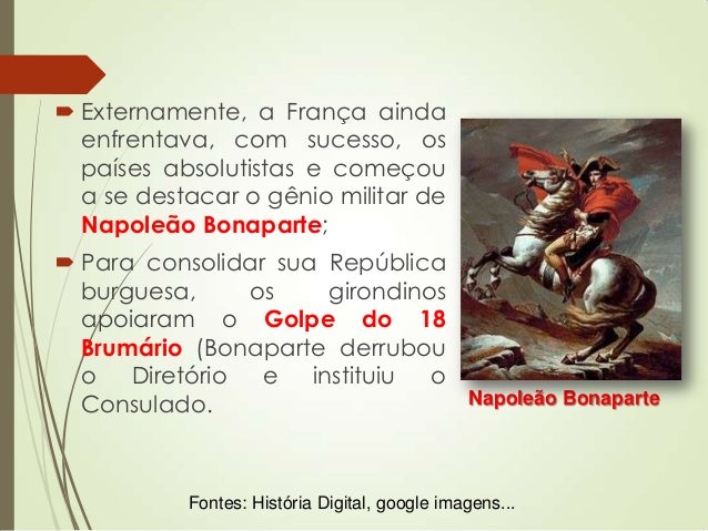 25. 25.  Externamente, a França ainda enfrentava, com sucesso, os países absolutistas e começou a se destacar o gênio militar de Napoleão Bonaparte;  Para consolidar sua República burguesa, os girondinos apoiaram o Golpe do 18 Brumário (Bonaparte derrubou o Diretório e instituiu o Consulado. Napoleão Bonaparte Fontes: História Digital, google imagens...