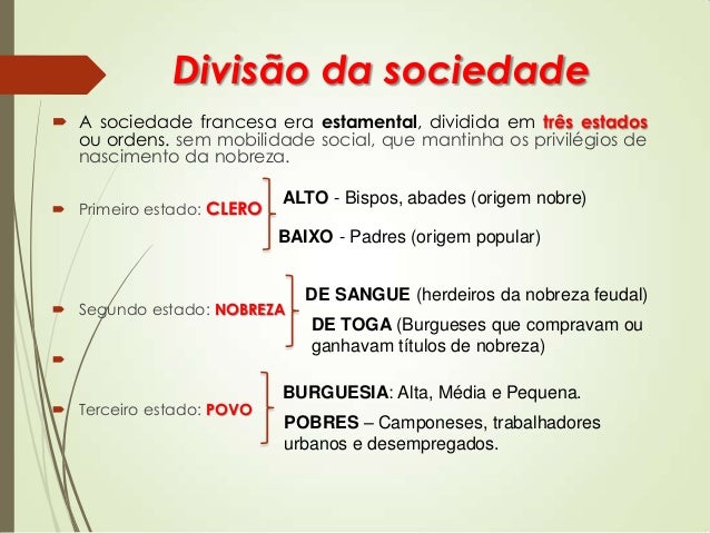 8. 8. Divisão da sociedade  Obs.: O primeiro e o segundo estados tinham isenção de impostos, logo o Estado francês era sustentado pelo terceiro estado (burguesia).