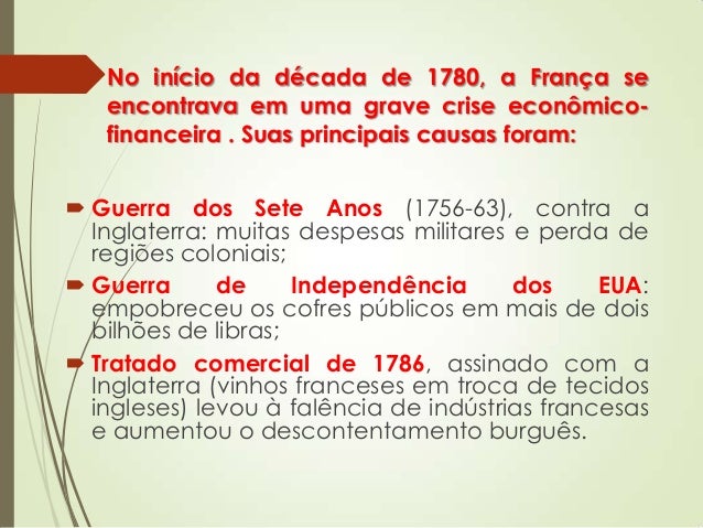 9. 9. No início da década de 1780, a França se encontrava em uma grave crise econômico- financeira . Suas principais causas foram:  Guerra dos Sete Anos (1756-63), contra a Inglaterra: muitas despesas militares e perda de regiões coloniais;  Guerra de Independência dos EUA: empobreceu os cofres públicos em mais de dois bilhões de libras;  Tratado comercial de 1786, assinado com a Inglaterra (vinhos franceses em troca de tecidos ingleses) levou à falência de indústrias francesas e aumentou o descontentamento burguês.