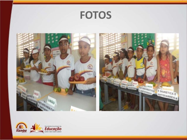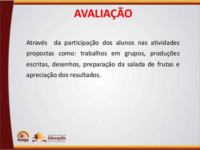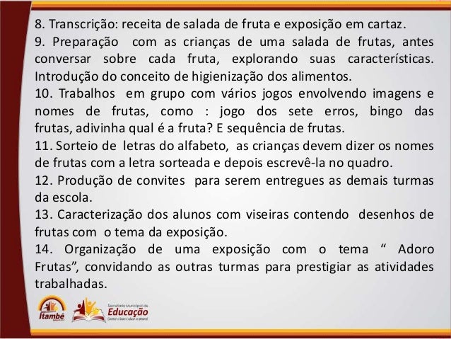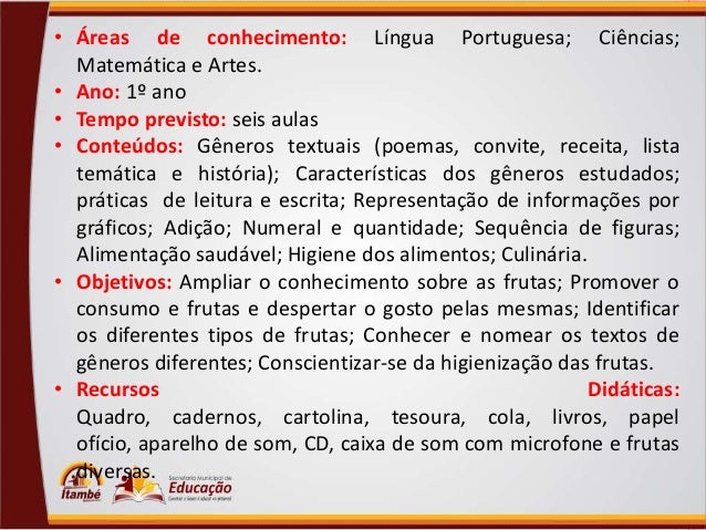 Objetivos: Ampliar o conhecimento sobre as frutas; Promover o consumo e frutas e despertar o gosto pelas mesmas; Identificar os diferentes tipos de frutas; Conhecer e nomear os textos de gêneros diferentes; Conscientizar-se da higienização das frutas.
