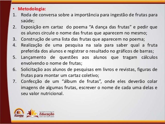 Exposição em cartaz do poema “A dança das frutas” e pedir que os alunos circule o nome das frutas que aparecem no mesmo;