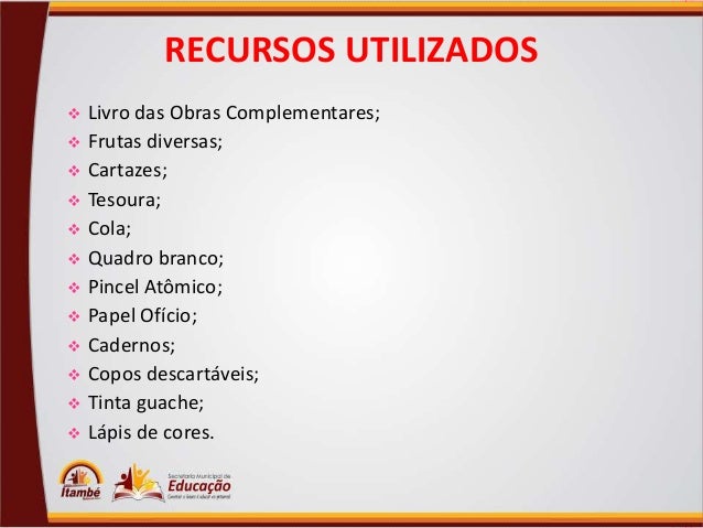 Recursos Didáticas: Quadro, cadernos, cartolina, tesoura, cola, livros, papel ofício, aparelho de som, CD, caixa de som com microfone e frutas diversas.
