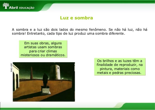 10. 10. Luz e sombra A sombra e a luz são dois lados do mesmo fenômeno. Se não há luz, não há sombra! Entretanto, cada tipo de luz produz uma sombra diferente. Em suas obras, alguns artistas usam sombras para criar climas misteriosos ou dramáticos. Os brilhos e as luzes têm a finalidade de reproduzir, naMAC-USP pintura, materiais como metais e pedras preciosas.
