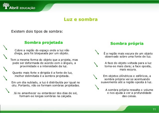 11. 11. Luz e sombraExistem dois tipos de sombra: Sombra projetada Sombra própria Cobre a região do espaço onde a luz não chega, pois foi bloqueada por um objeto. É a região mais escura de um objeto observado sobre uma fonte de luz.Tem a mesma forma do objeto que a projeta, mas pode ser deformada de acordo com o ângulo, a A face do objeto voltada para a luz proximidade e a intensidade da luz. torna-se mais clara; a face oposta, mais escura. Quanto mais forte e dirigida é a fonte de luz, melhor delimitada é a sombra projetada. Em objetos cilíndricos e esféricos, a sombra própria vai se acentuandoEm um dia nublado, a luz é distribuída por igual no suavemente até a região oposta à luz.céu. Portanto, não se formam sombras projetadas. A sombra própria ressalta o volume Já no amanhecer ou entardecer dos dias de sol, e nos ajuda a ver a profundidade formam-se longas sombras na calçada. das coisas. 11