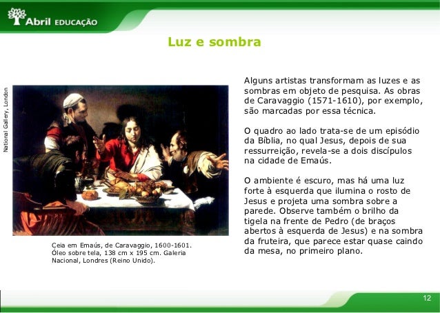 12. 12. Luz e sombra Alguns artistas transformam as luzes e as sombras em objeto de pesquisa. As obrasNational Gallery, London de Caravaggio (1571-1610), por exemplo, são marcadas por essa técnica. O quadro ao lado trata-se de um episódio da Bíblia, no qual Jesus, depois de sua ressurreição, revela-se a dois discípulos na cidade de Emaús. O ambiente é escuro, mas há uma luz forte à esquerda que ilumina o rosto de Jesus e projeta uma sombra sobre a parede. Observe também o brilho da tigela na frente de Pedro (de braços abertos à esquerda de Jesus) e na sombra Ceia em Emaús, de Caravaggio, 1600-1601. da fruteira, que parece estar quase caindo Óleo sobre tela, 138 cm x 195 cm. Galeria da mesa, no primeiro plano. Nacional, Londres (Reino Unido). 12